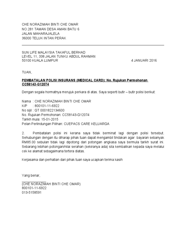 Fahamkan jika proses pembatalan yang perlu diikuti. Polisi insurans atau perlindungan takaful yang telah. Contoh surat pembatalan insurans sun life.
